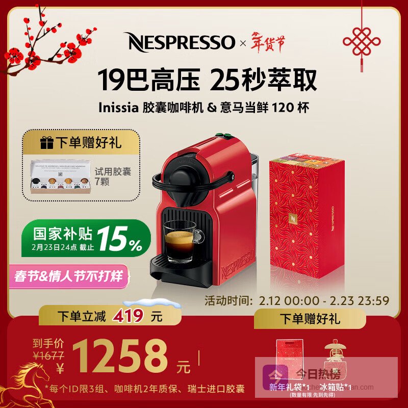 Nespresso奈斯派索胶囊咖啡机小型家用全自动商用办公室小巧便携高压萃取可折叠杯架意式进口新年礼物 C40 红色+新年套装120颗(赠试用胶囊7颗)¥