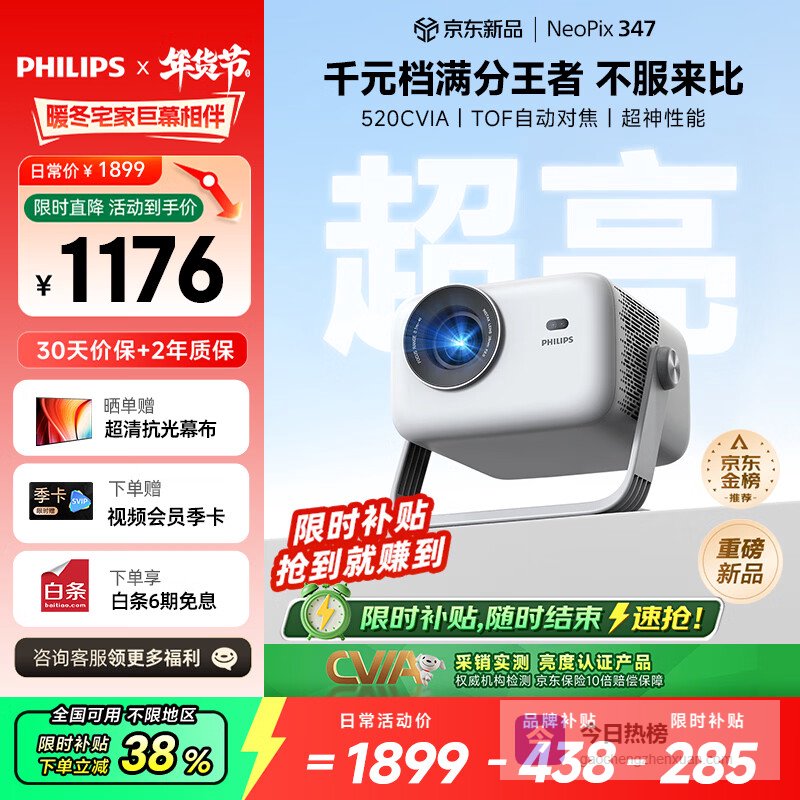 【京东自营】飞利浦天眼云台投影仪家用家庭影院真1080P高清智能便携卧室投影机NeoPix347¥