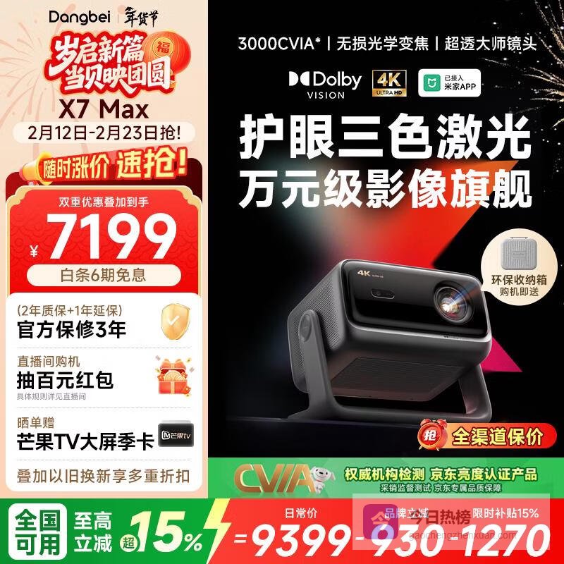【京东自营】当贝X7Max4K超高清三色激光投影仪家用变焦移轴家庭影院卧室国家补贴¥