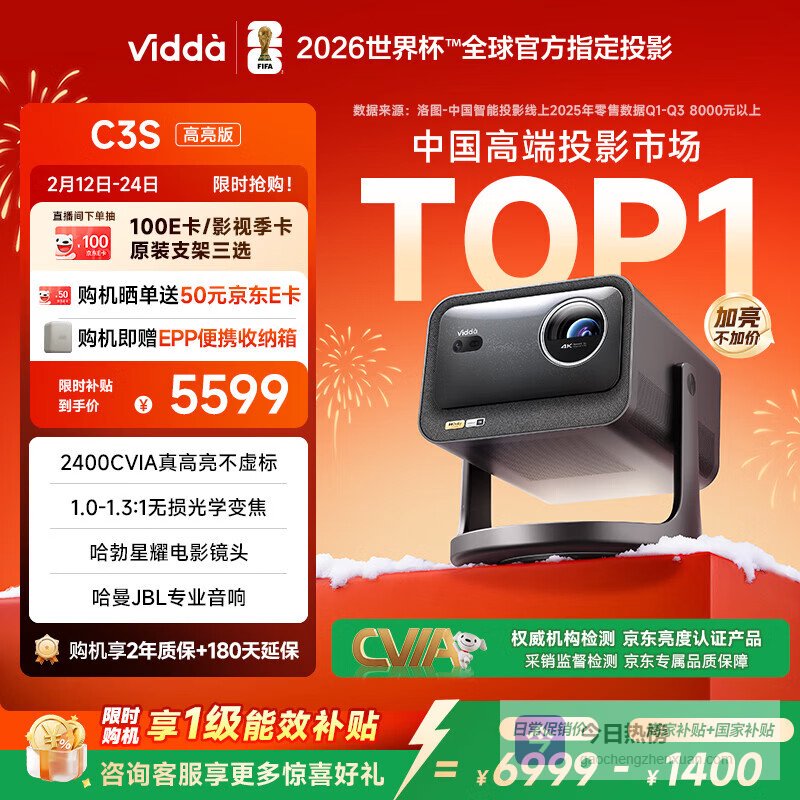【京东自营】ViddaC3S高亮版海信4K超高清纯三色激光变焦投影仪家用投影机2400CVIA+杜比¥