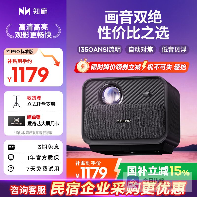 【京东自营】知麻Z1PRO投影仪家用超高清投影机智能家庭影院原生1080P卧室投影AI自动对焦国家补¥