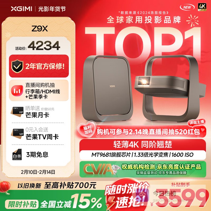 【京东自营】极米Z9X4K全新轻薄4K光学变焦投影1600ISO真实高亮家用智能云台投影仪国家补贴¥
