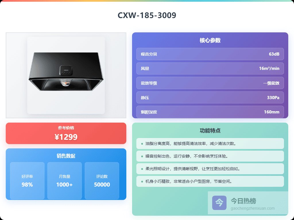 ▶ 静音设计:采用降噪技术,结合蜗壳减震孔和外圈吸音棉,运行时噪音控制在66dB以内,不用担心开一会儿油烟机吵得难受,厨房环境更安静。