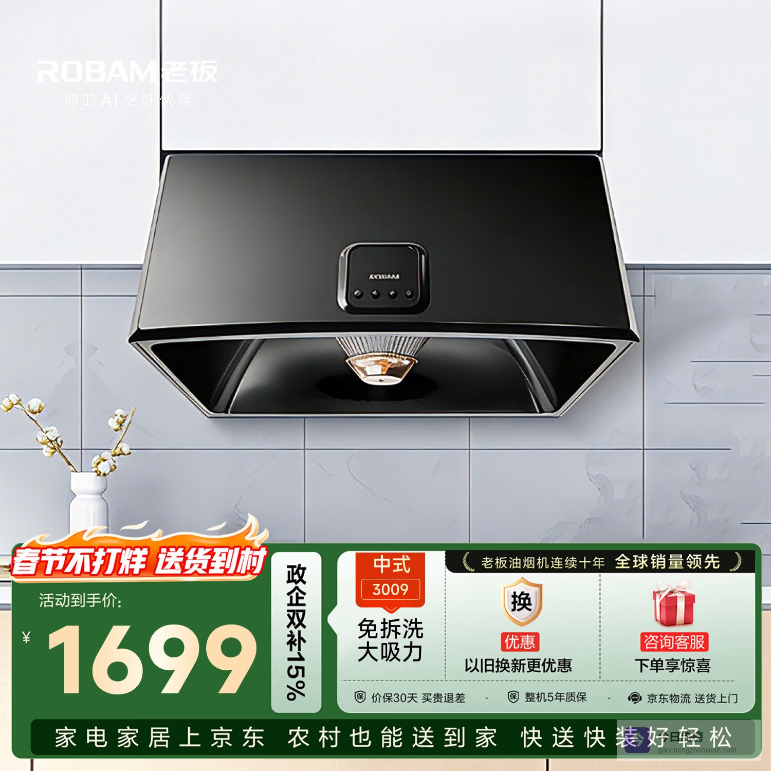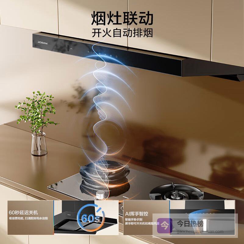 ▶ 高效锁烟:老板油烟机采用顶侧双吸设计,能更高效地锁住油烟,避免油烟外溢。这样一来,烹饪时油烟能迅速被吸走,厨房空气就更清新,避免油烟散出到客厅或其他区域。