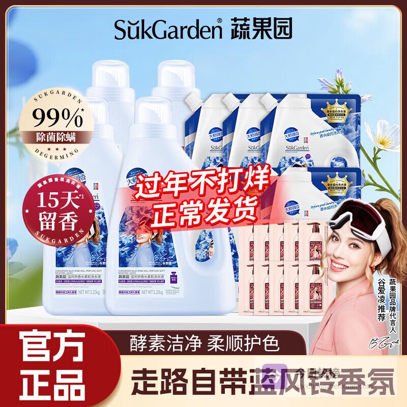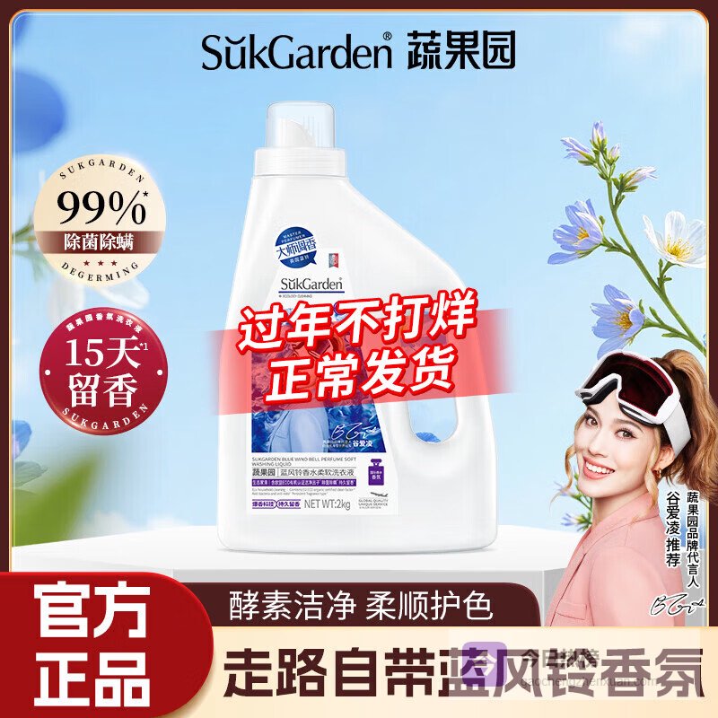 蔬果园蓝风铃香氛洗衣液快速洗净持久留香除菌除螨洗衣液婴儿大人可用【母婴可用】15斤|蓝风铃香氛¥