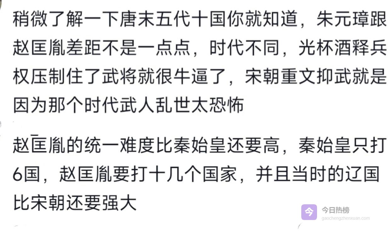 秦始皇属于是从无到有、开创大一统,赵匡胤则是收拾残局,恢复中原秩序的局部统一,是比不上秦始皇的。