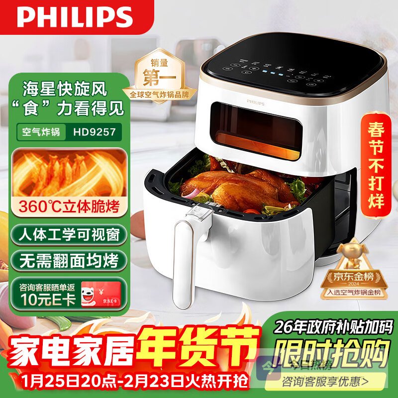 第2款:飞利浦HD9257/20【可视窗口设计】这个空气炸锅有个可视窗口,这个设计确实挺实用。以前做炸物最怕的就是不知道里面熟没熟,有了这个窗口,随时都能观察食物的上色情况,火候掌握起来就方便多了,再也不用担心炸糊了。