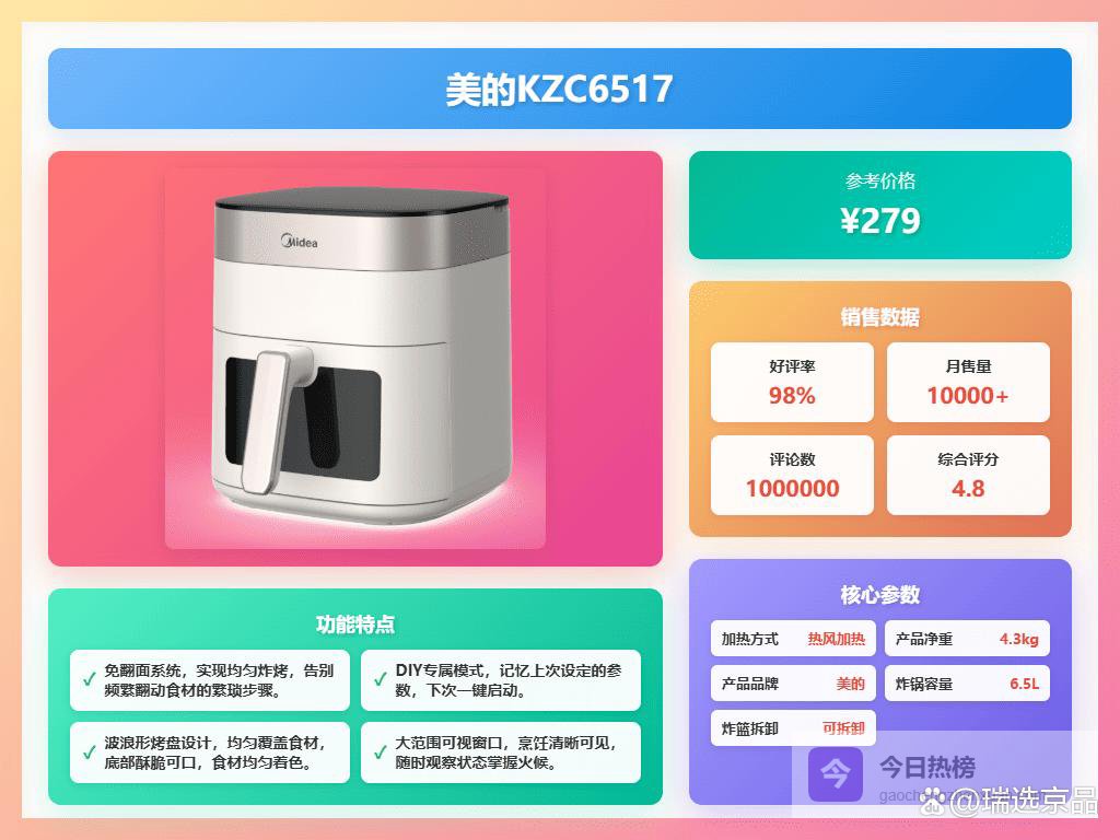 第1款:美的KZC6517【免翻面系统】这个空气炸锅最方便的是,它有个X旋风3.0免翻面系统,意思就是炸东西的时候不用你老盯着,也不用手动翻来翻去,它自己就能把食物炸得挺均匀,省事不少。热风搅动,让食物熟得快,颜色也好看。
