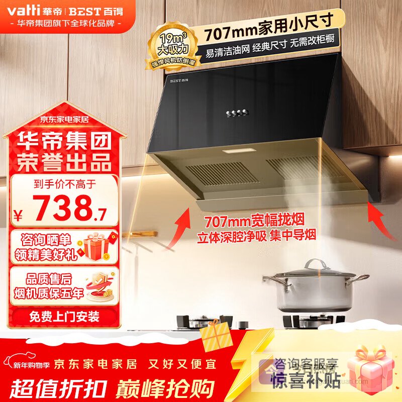 百得(BEST)华帝出品顶侧双吸油烟机28立方大吸力三腔变频脱排定时燃气灶烟灶联动自动清洗七字型烟灶套装E738 单烟机变频大吸力E738¥