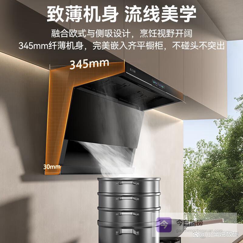 ① 顶侧双吸:这个油烟机采用顶吸和侧吸结合的设计,可以更全面地锁住厨房里的油烟。烹饪时油烟会被快速吸走,不容易到处飘,让厨房空气一直保持清新。