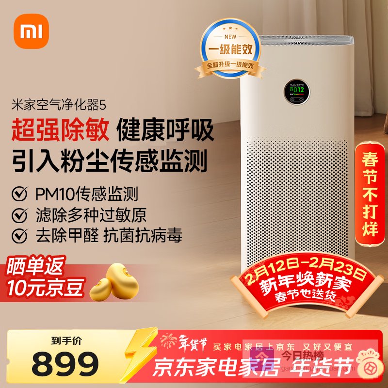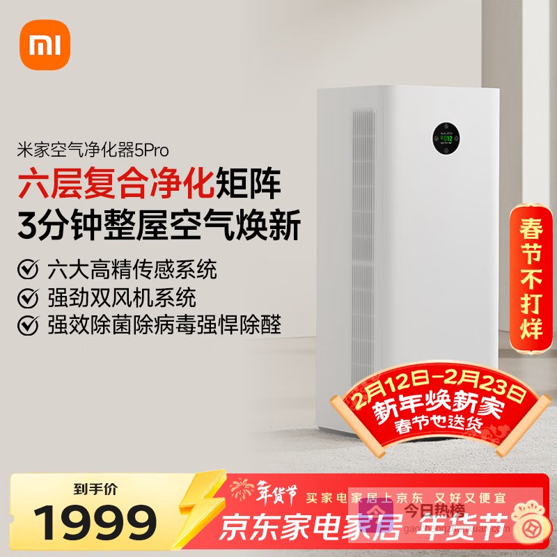 【京东自营】米家小米空气净化器5Pro家用除甲醛除菌除过敏原¥