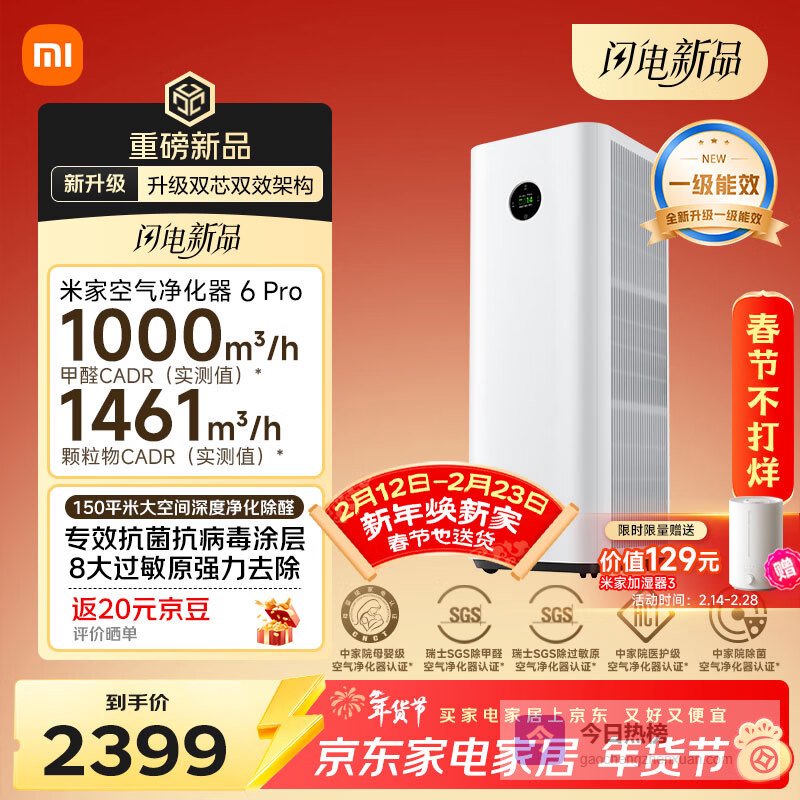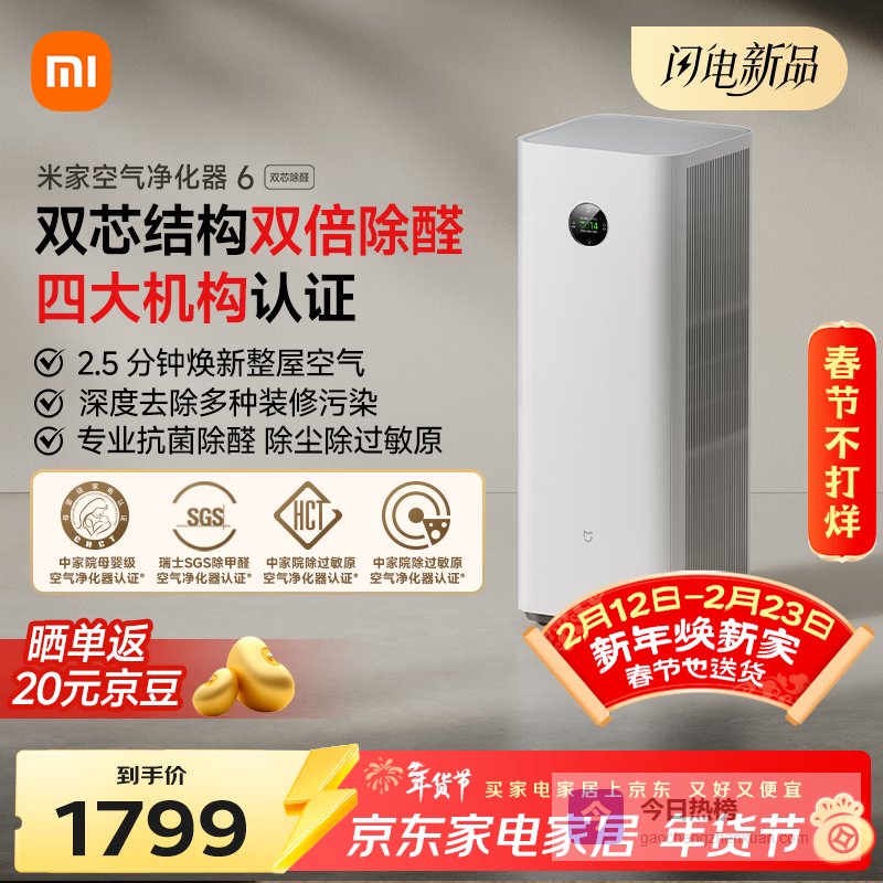 【京东自营】米家【热销新品】小米空气净化器6双芯除醛家用除甲醛除菌除味除过敏原认证京东自营¥