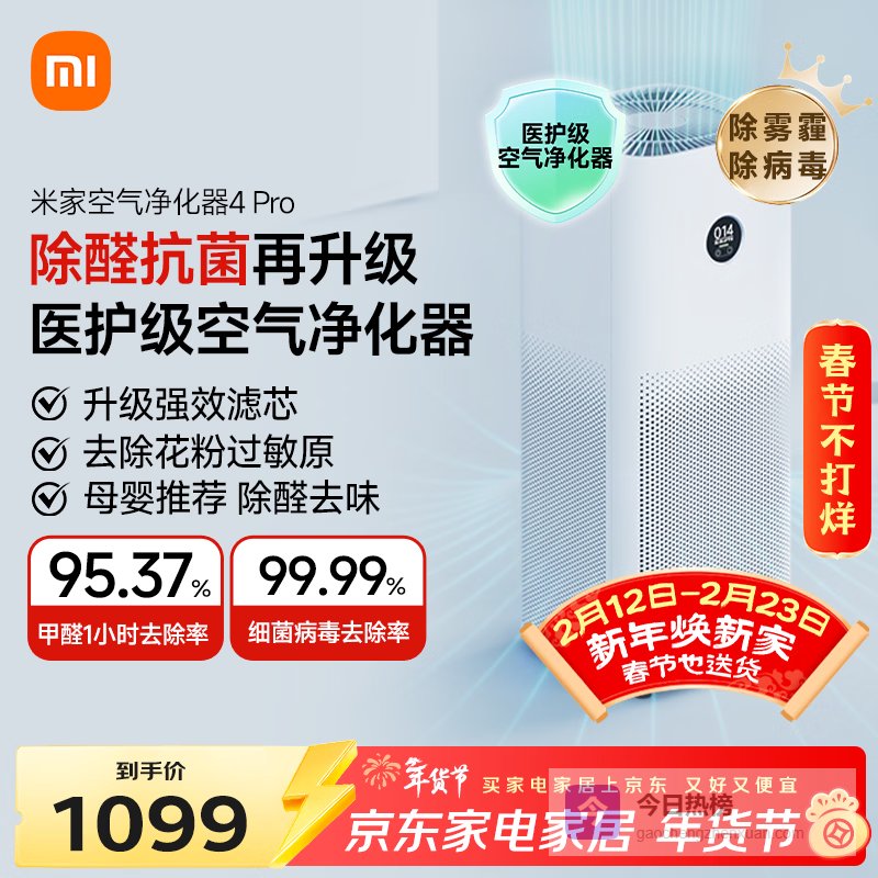 【京东自营】米家小米空气净化器4Pro除甲醛除菌除异味负离子空气伴侣低噪设计¥