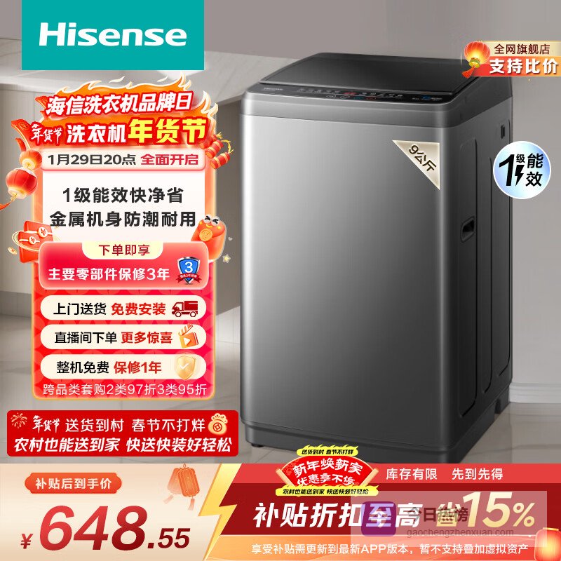 海信(Hisense)波轮洗衣机全自动 9KG洗衣机 健康家用租房宿舍金属机身一级能效除螨HB90DC30以旧换新国家补贴¥