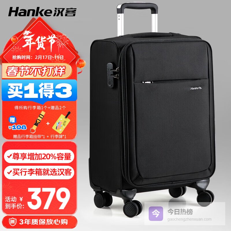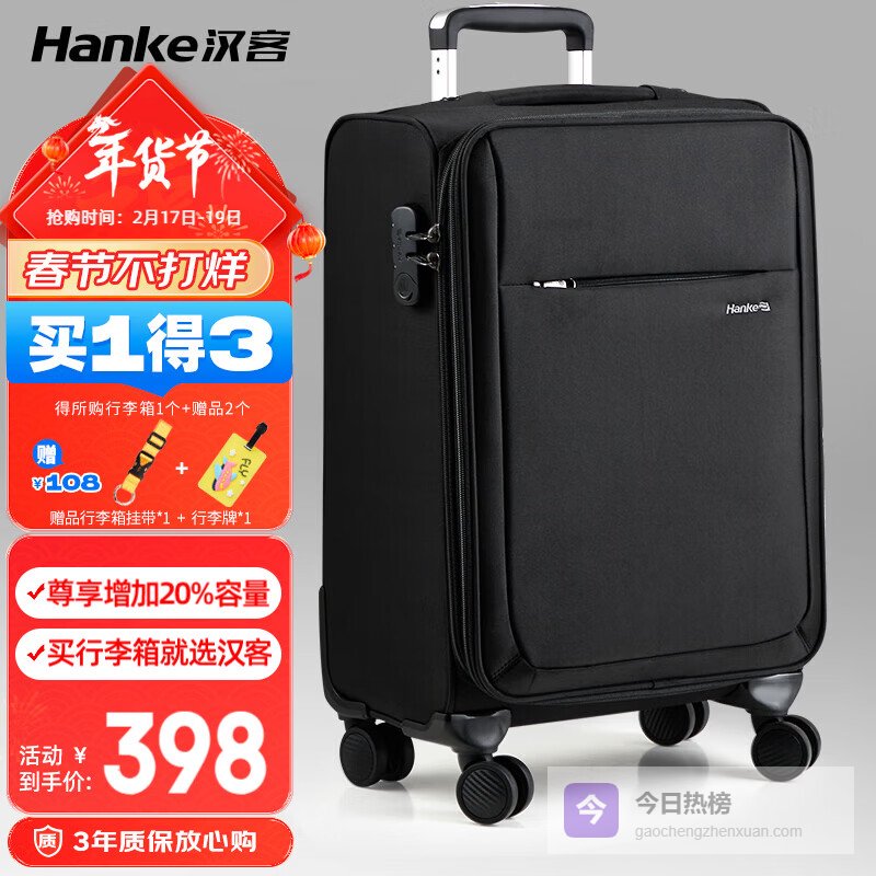 说到性价比高,汉客的拉杆箱确实有一套。箱子不仅坚固耐用,里面的空间也设计得特别合理。想带多点东西的时候,拉开扩展空间,能多放不少,旅行的时候特方便。尤其是在寒冷或热的地方旅行时,它的耐磨材质还能提供多一层保护,不用担心箱子受损。总之,我感觉如果你需要一个贴心的旅伴,它绝对能胜任。接下来我整理了3款口碑不错的,大家可以看看。