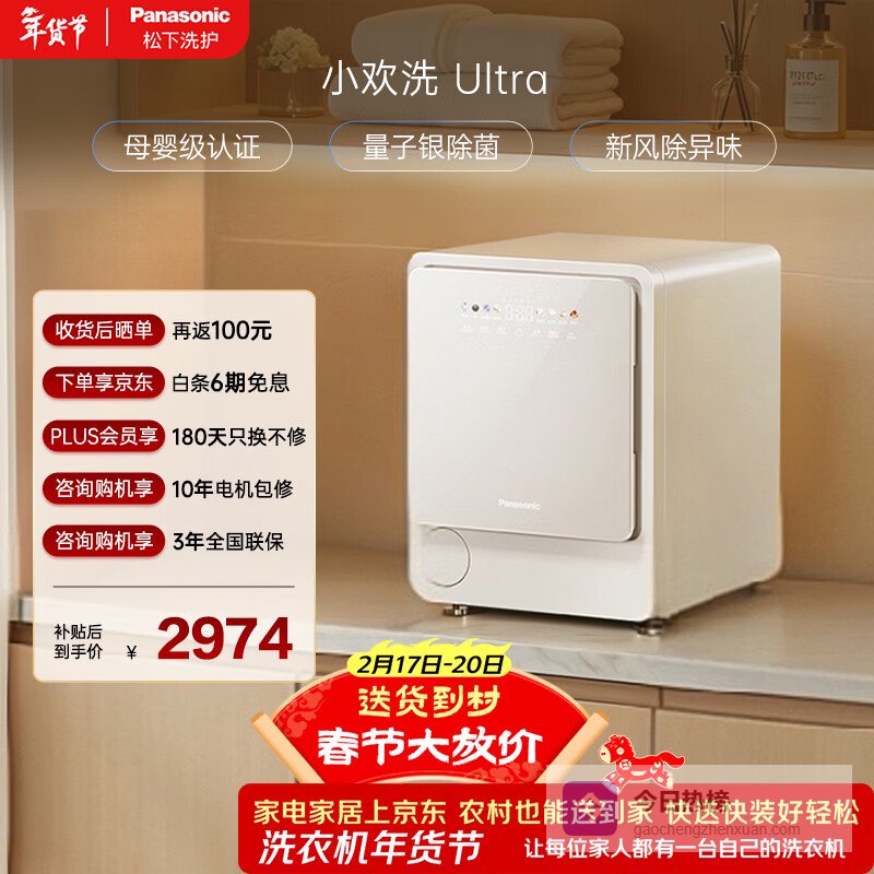 【京东自营】松下小欢洗Ultra滚筒洗烘2KG小型全自动迷你内裤内衣洗衣机母婴认证除菌螨XQG20-¥