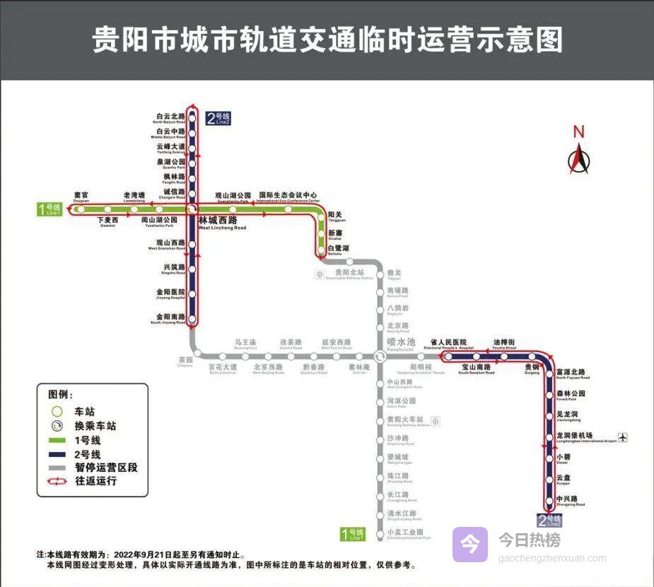 自9月21日起,贵阳地铁1号线仅保留窦官站—白鹭湖站,2号线保留白云北路站—金阳南路站、省人民医院站—中兴路站,其余区段继续暂停运营。简单说:想坐地铁出城或进城,目前都不行,只能在“圈内”转转。