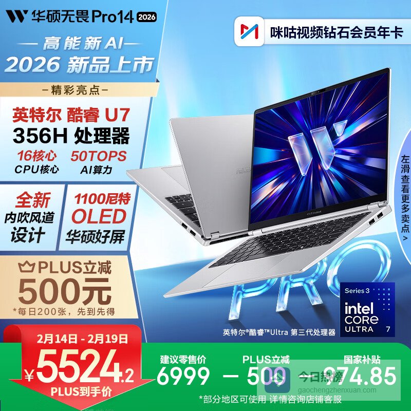 【京东自营】华硕无畏Pro14酷睿版2026国家补贴15%第3代Ultra7AI轻薄本笔记本电脑¥
