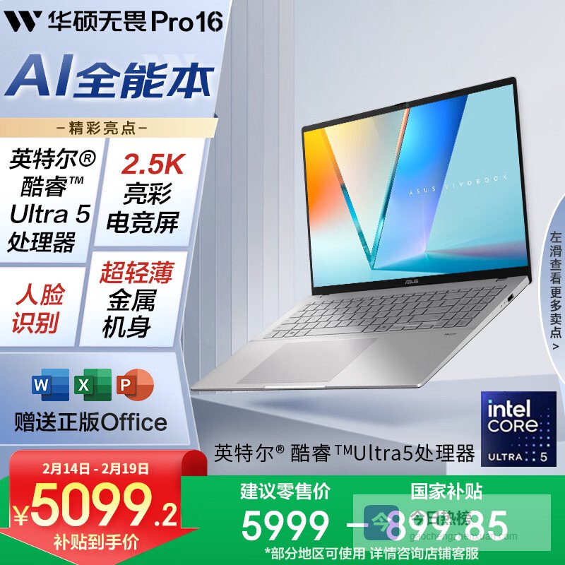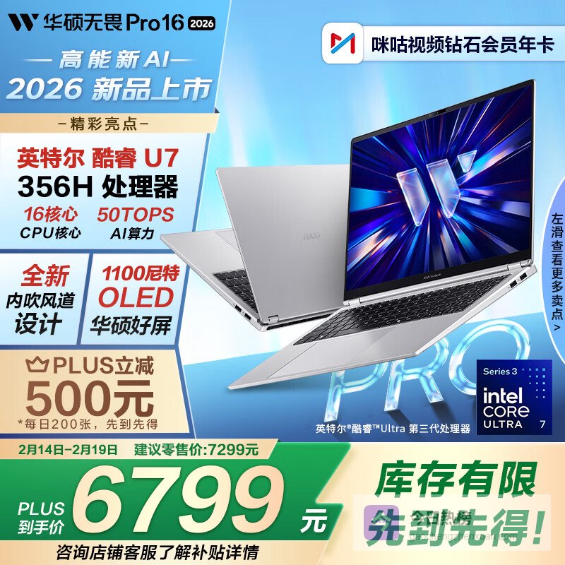 【京东自营】华硕无畏Pro16酷睿版2026国家补贴15%第3代Ultra7AI轻薄本笔记本电脑¥