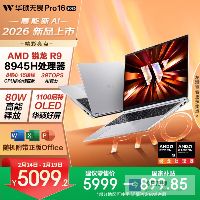 【京东自营】华硕无畏Pro16锐龙版2026国家补贴15%AI轻薄本笔记本电脑¥