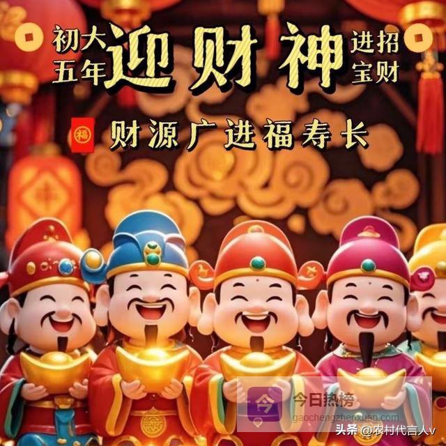 送走了穷神,接下来就要迎接财神啦!财神可是大家都喜欢的神仙,他掌管着人间的财富。初五这天,是财神的生日,人们会在这一天早早地起床,摆上丰盛的祭品,点燃香烛,迎接财神爷的到来。