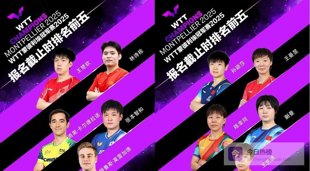 超强选手阵容依旧亮眼:男单争冠队伍里,有世界冠军王楚钦,还有两届WTT大满贯冠军林诗栋打头阵;特鲁斯·莫雷加德不久前刚在瑞典主场赢得WTT大满贯,现在状态正佳;雨果·卡尔德拉诺在澳门站拿到了个人第二个WTT冠军赛的亚军,他希望在蒙彼利埃能取得更好成绩;张本智和更是想拿下这个级别赛事的第三个冠军。