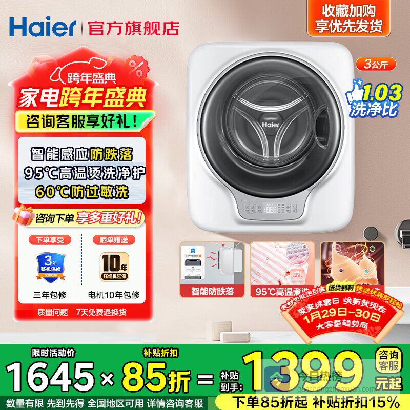 4、海尔3公斤洗衣机这款洗衣机考虑得很周到!95℃高温除菌和60℃内衣洗涤功能,绝对是贴身衣物的福音,除菌率≥99.99%,干净又安心。而且它还有专属防过敏洗,能减少过敏源残留,这对于有宝宝的家庭来说简直太棒了,不用担心娇嫩的肌肤会受到刺激。