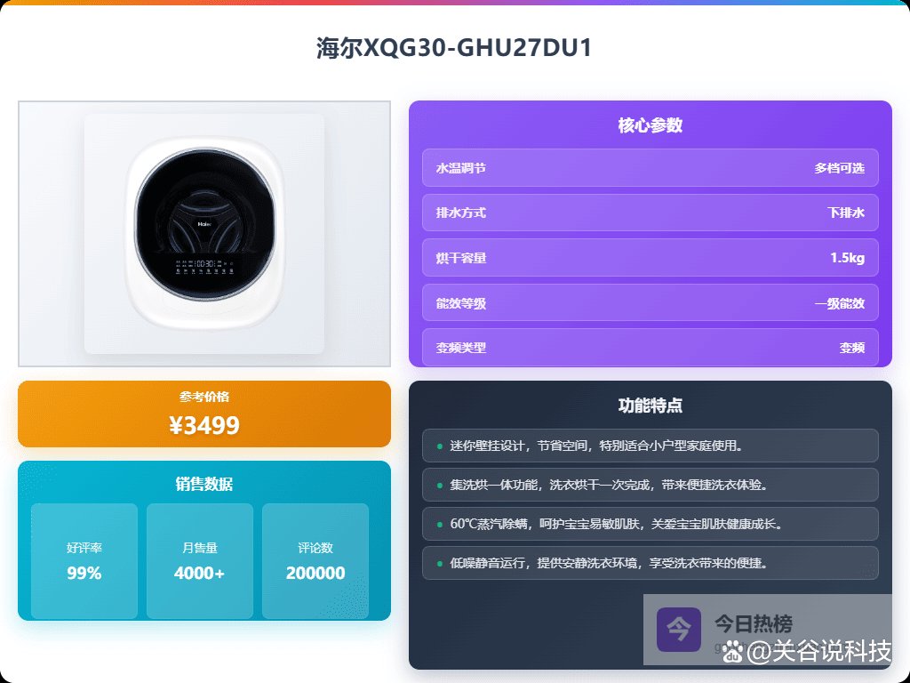 3、海尔XQG30-GHE68WNU1这款海尔壁挂洗衣机,小身材却拥有大能量!3kg容量,轻松满足内衣裤、宝宝衣物的专属洗涤需求。95℃高温煮洗,除菌更安心,呵护娇嫩肌肤。活水精华洗,还能减少衣物磨损,让衣物保持鲜亮。