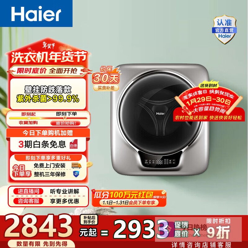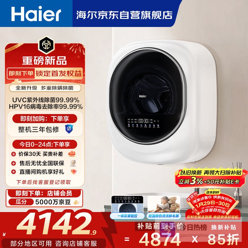 海尔(Haier)壁挂洗衣机洗烘一体全自动 3KG 母婴分区 迷你小型内衣裤洗 精华洗 除菌 补贴XQG30-GHE68WNU1¥