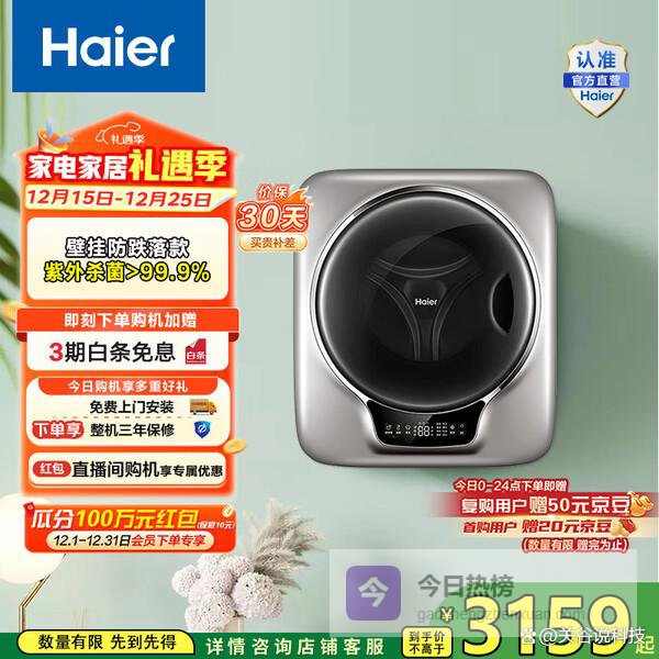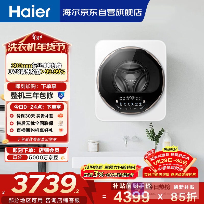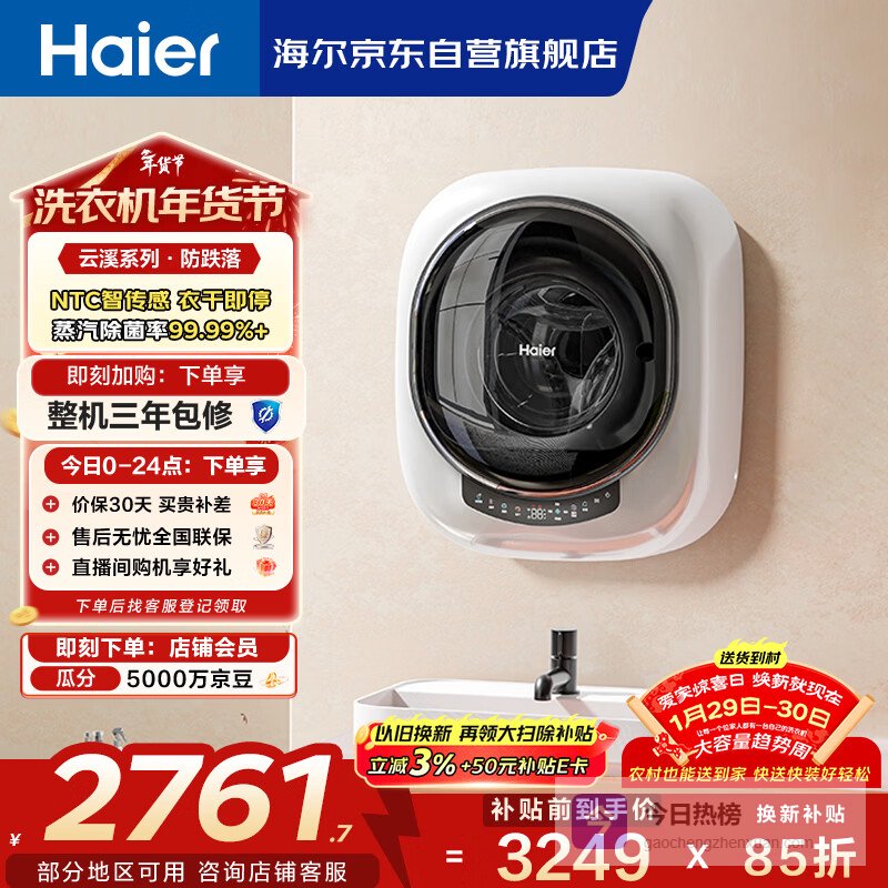 海尔(Haier)洗衣机小型全自动 内衣婴儿懒人洗衣机 壁挂洗烘一体家用 3KG除菌螨 国家补贴20% 一级能效云溪715¥