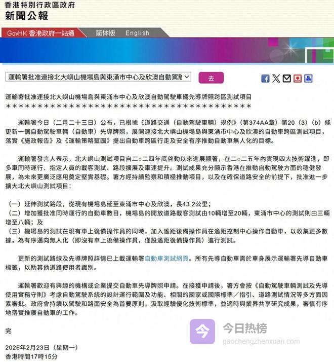 香港特区政府新闻公报公布本次自动驾驶车辆先导牌照跨区测试项目