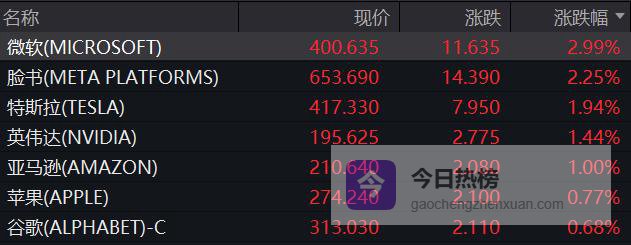 美股“七巨头”全线拉升,推动大盘走高,万得美国科技七巨头指数上涨1.44%。个股方面,微软涨近3%,脸书涨超2%,特斯拉涨近2%,英伟达涨超1%,亚马逊涨1%,苹果涨0.77%,谷歌涨0.68%。