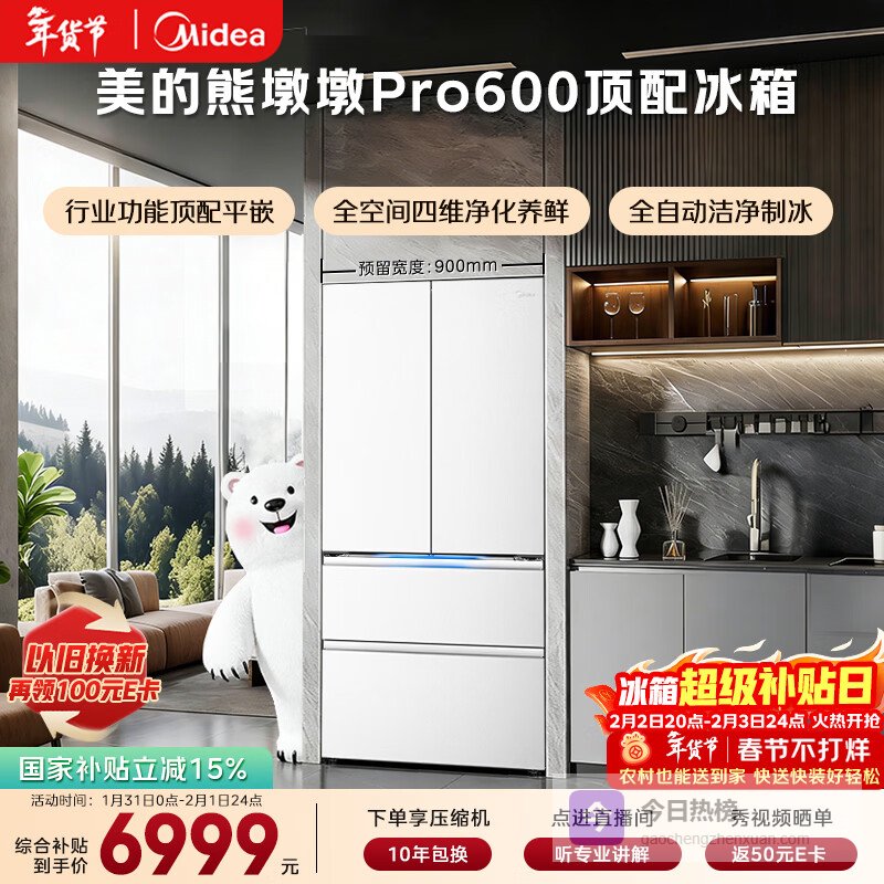【京东自营】美的熊墩墩Pro600L法式四开门冰箱超薄嵌入式双系统一级能效除菌制冰大容量BCD-60¥