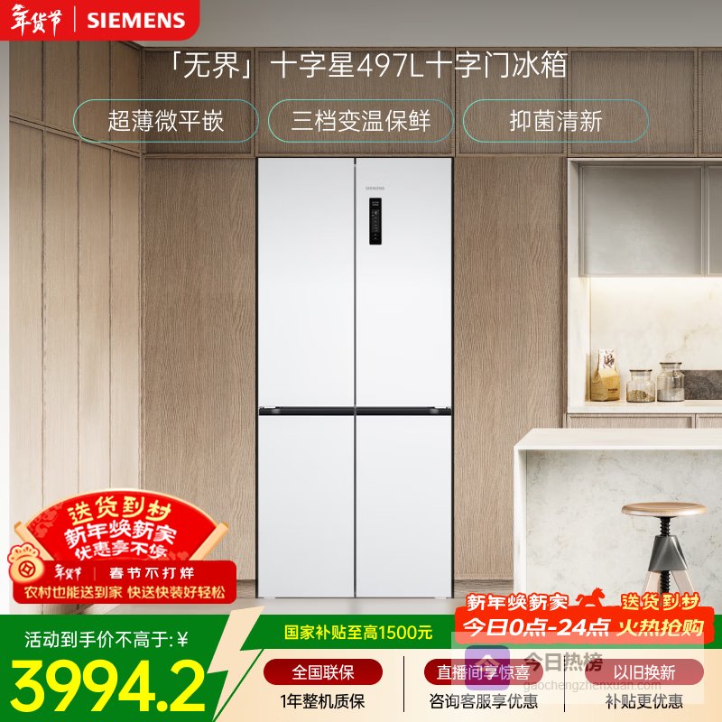 【京东自营】西门子无界十字星497L十字门冰箱超薄微平嵌抑菌清新一级能效KC502080EC国家补贴¥