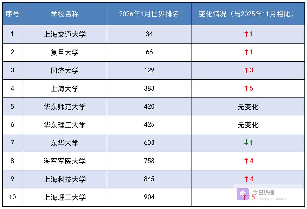 具体排名变动可以参考这组数据:上海交通大学从35名上升到34名,复旦大学从67名上升到66名,同济大学从132名上升到129名,上海大学从388名上升到383名,海军军医大学从762名上升到758名,上海科技大学从849名上升到845名,上海理工大学从919名上升到904名;