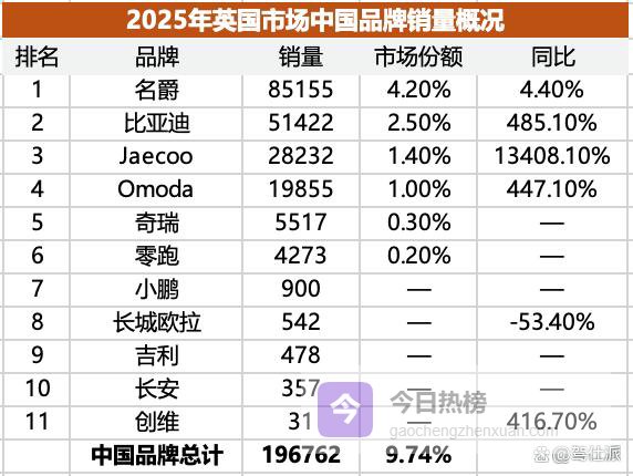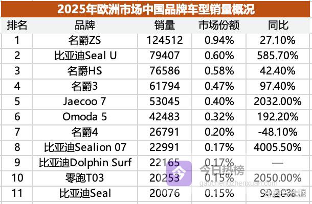 在如此繁重的税率之下,中国品牌2025年在欧洲市场的总体销量达到73.4万辆,占据5.5%的市场份额,且在榜的绝大多数品牌,都实现了两位数、三位数甚至四位数的同比增幅。