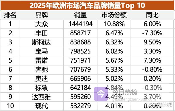 欧洲市场销量最高的10个品牌中,有8个都是欧洲本土品牌,唯二挤入前十的外来品牌分别是排名第二的丰田和排名第十的现代。