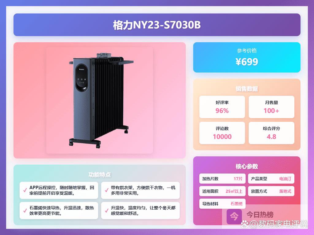 整体而言,格力NY23-S7030B是一款性能可靠、安全性高的电油汀,适合25平方米以上的空间使用。如果追求快速加热、智能调节和安全保障,这款产品确实值得考虑。