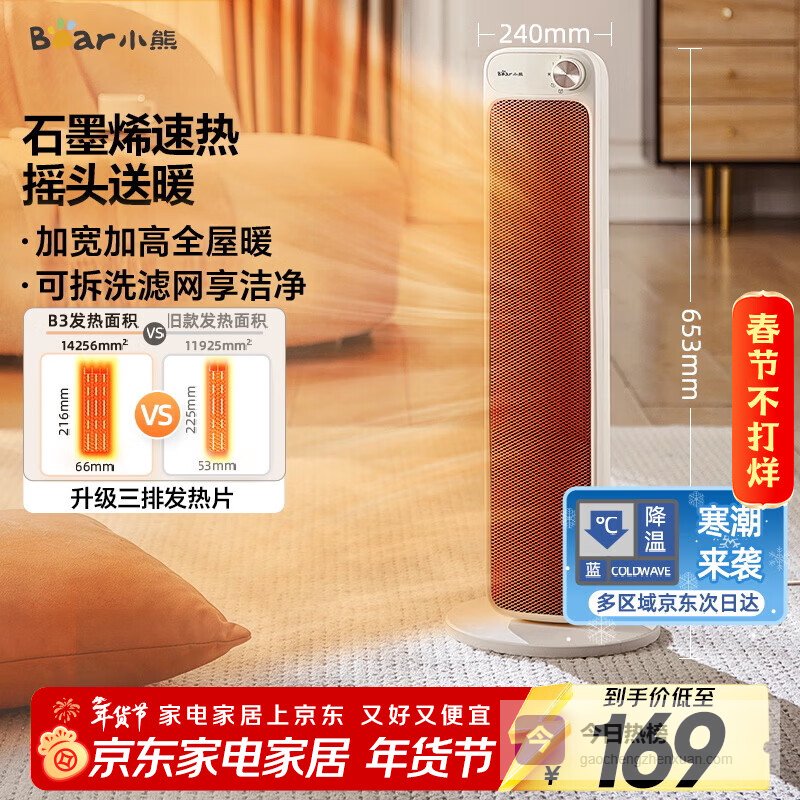 小熊(Bear)取暖器石墨烯暖风机家用电暖器加高速热电暖气立式摇头电热风扇大面积轻音节能热风机DNQ-F20B3¥