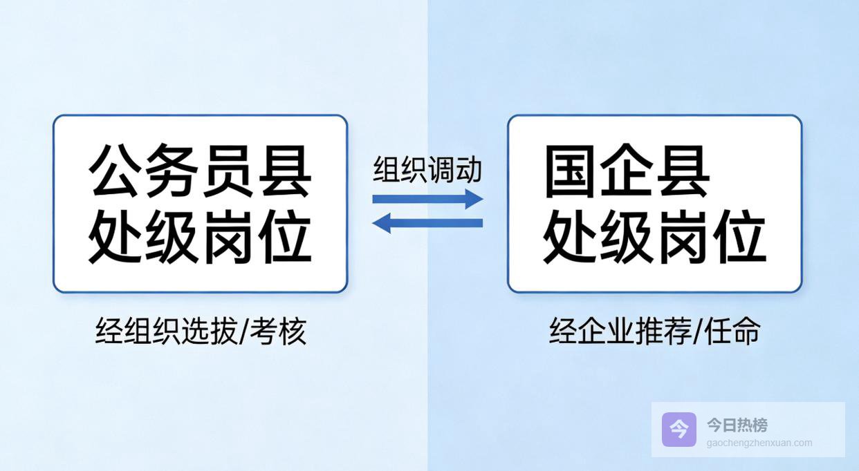 简单说,公务员体系的县长、县委副书记等县处级干部,可调任国企担任董事长、总经理;而国企的县处级领导,也能调到机关任职,级别不变、待遇相应调整。身边就有真实案例,某县处级干部从机关调任省属国企副职,后来又调回机关任职,实现了双向流动。