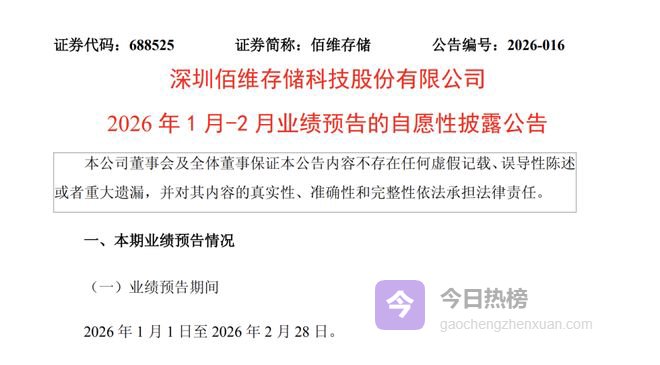 今日,佰维存储发布公告,经财务部门初步测算,预计2026年1月-2月实现营业收入40.00 亿元至45.00 亿元,与上年同期相比,将增加30.91 亿元至35.91 亿元,同比增长340.00%至395.00%。