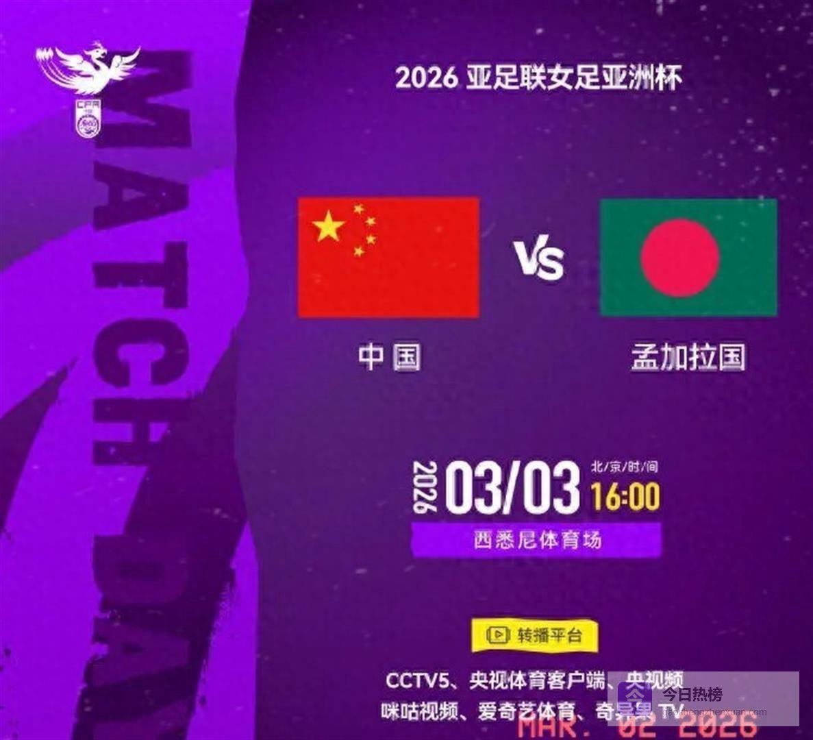 北京时间2026年3月3日下午4点,2026年女足亚洲杯B组首轮比赛正式打响。 卫冕冠军中国女足在澳大利亚悉尼的西悉尼体育场,迎来了小组赛的第一个对手孟加拉国女足。 这场比赛对于国内球迷而言,观看渠道非常明确,央视体育频道CCTV5对比赛进行了现场直播。 同时,央视体育客户端、央视频、咪咕视频等多个平台也同步提供了直播信号。
