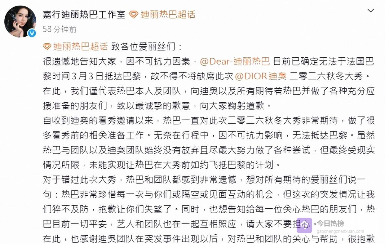 迪丽热巴以迪奥全球品牌大使身份受邀出席巴黎时装周,巴黎时间3月3日的Dior 2026秋冬大秀,她原本要亮相