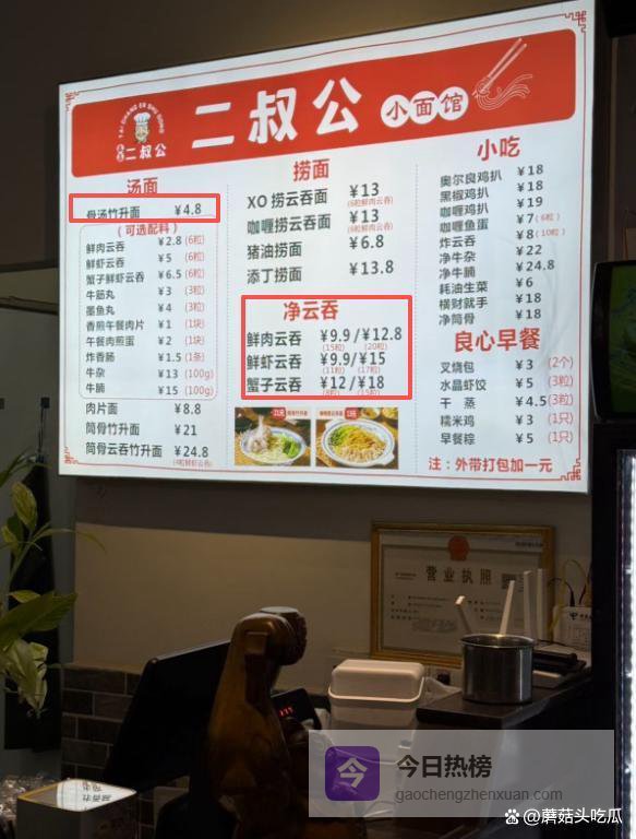 目前,刘锡贤面店的食物价位也曝光了。从网友曝光的视频中可以看到,一碗鲜虾云吞面卖9.9元,一碗骨汤竹升面卖4.8元。