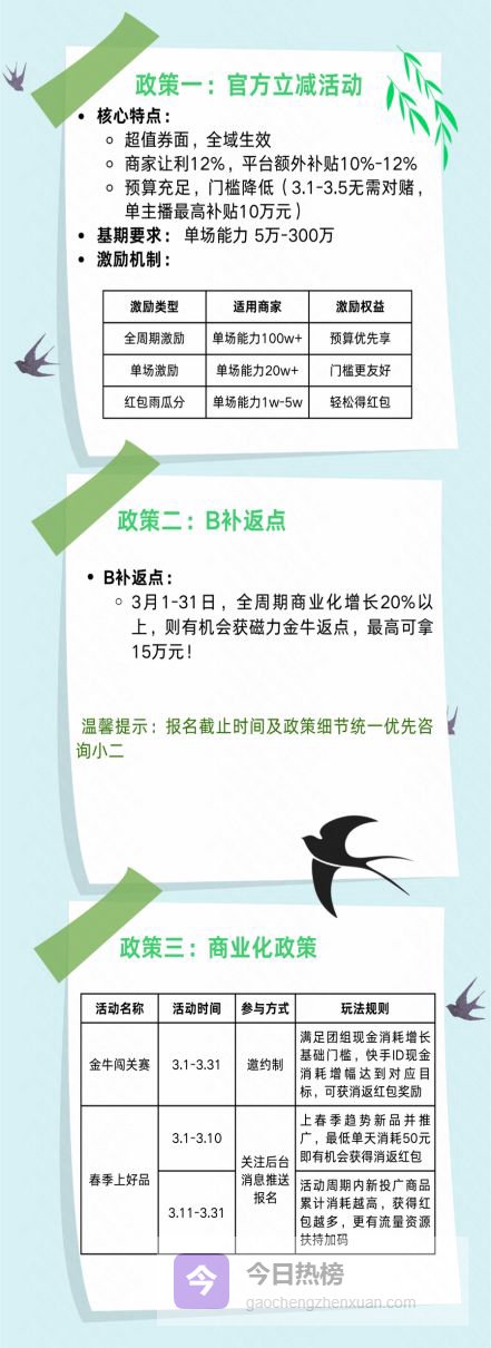 在此基础上,快手电商为商家提供了多重激励,推出官方立减活动,商家达到让利门槛即可获得平台10%-12%的额外补贴。针对不同商家,还设有全周期激励、单场激励及红包雨瓜分的多重激励机制,单主播最高补贴可达10万元。期间,全周期商业化增长20%以上商家,则有机会获得最高15万元的磁力金牛返点补贴,此外还设置了金牛闯关赛、春季上好品两类政策机制,完成目标的商家即有机会获得红包奖励及海量流量资源。