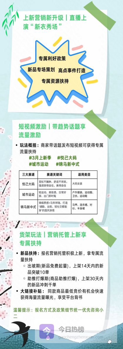 具体来说,短视频激励方面,平台推出大码悦己、城市运动、锦马新中式三大核心趋势,商家带#春日趋势风暴 #氧气感穿搭 #高智运动风 #锦马新中式 趋势话题发布相关短视频,即可获得专属流量扶持,以内容种草精准锁定目标用户;货架玩法上,商家报名营销托管上新可享受专属扶持,包括了新品扶持和大链接补贴,助推出新品高效打爆。