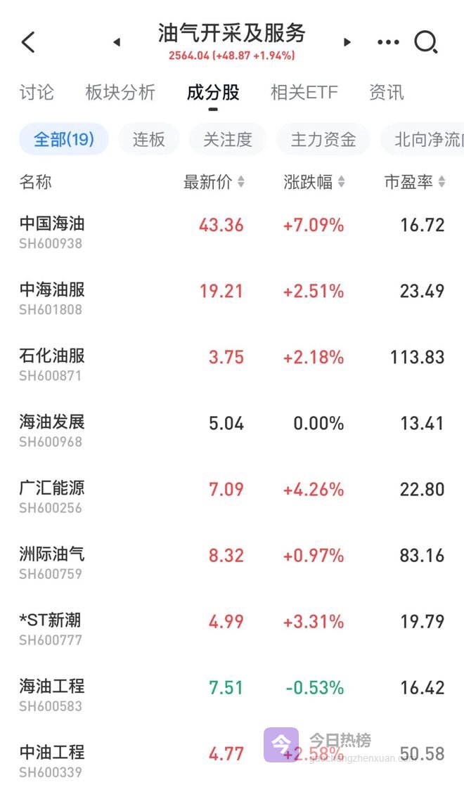 中东地缘冲突引爆的能源危机还在持续发酵, 油价早盘一度暴涨, 午后有消息称七国集团将讨论联合释放紧急石油储备,原油价格出现跳水,油气板块冲高回落,但中国海油、潜能恒信、通源石油等仍涨幅居前。
