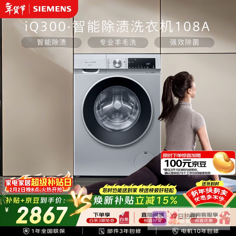 【京东自营】西门子iQ30010KG大容量全自动变频滚筒洗衣机智能除渍强效除螨羊毛洗15分钟快洗WG¥