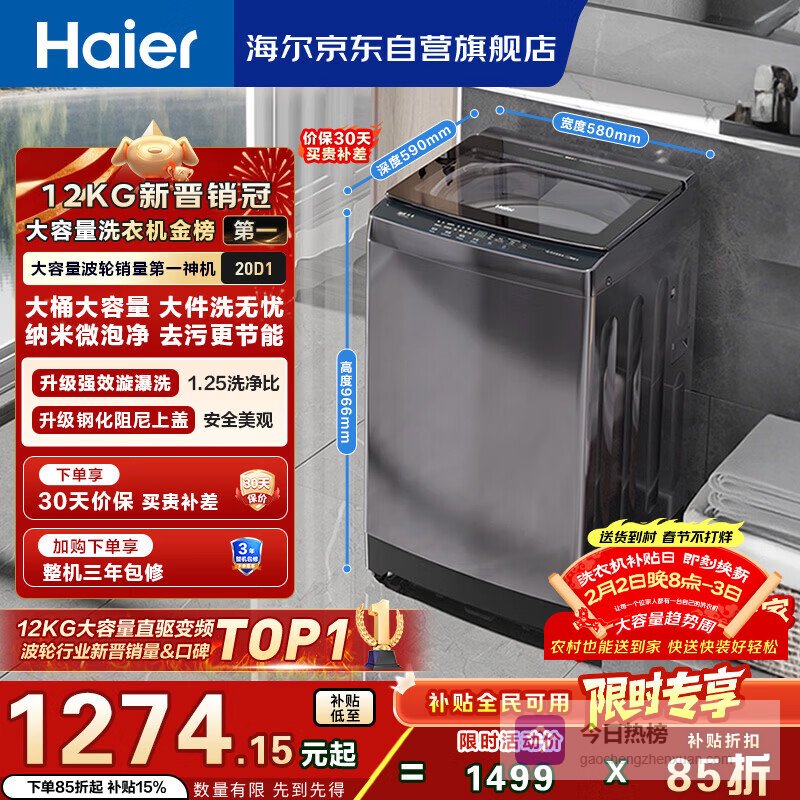 【京东自营】海尔全自动波轮洗衣机12KG大容量玻璃上盖家用家电国家补贴以旧换新XQB120-BZ20¥