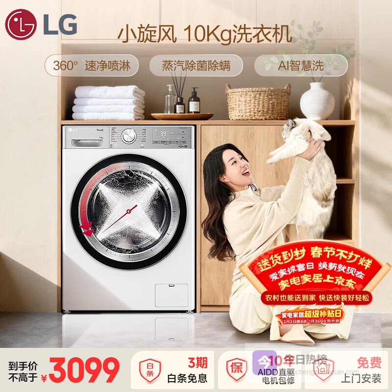 【京东自营】LG小旋风10KG滚筒洗衣机全自动家用大容量360°速净喷淋蒸汽除菌螨AI智慧洗FCW1¥